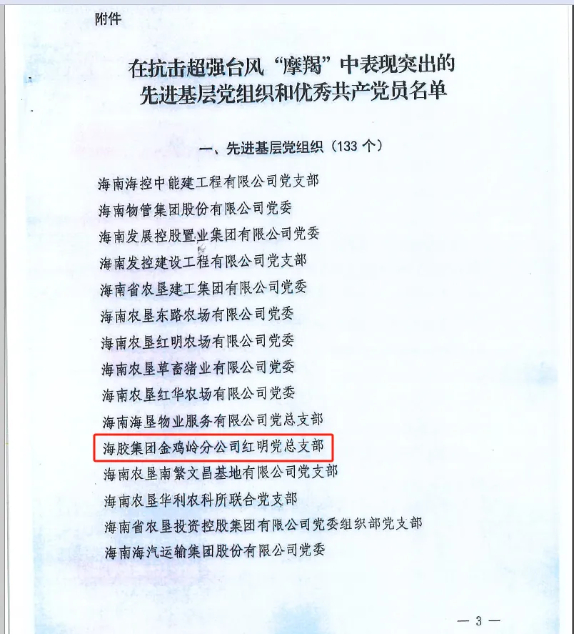 近日,中共海南省農(nóng)墾投資控股集團有限公司委員會下發(fā)《關(guān)于表彰在抗擊超強臺風”摩羯“中表現(xiàn)突出的先進基層黨組織和優(yōu)秀共產(chǎn)黨員的決定》。海南橡膠黨委、金雞嶺分公司紅明黨總支、西聯(lián)分公司新盈片區(qū)黨總支、紅光分公司紅旗片區(qū)黨總支第四支部等4個先進基層黨組織,海南橡膠黨委委員、副總經(jīng)理陳皞,人力資源部高雷,瑞橡公司翟翊先,紅華分